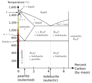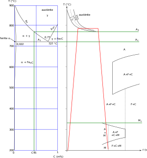 pearlite وفي طبقات متتالية رقيقة ومتجانسة. ويتكون البيرلايت من مخلوط من "فريت الحديد" (حديد خالٍ تقريبًا من الكربون) و"سمنتيت" (حديد يحتوي على نسبة أكبر من 6و6% كربون)، وتتكون هذه عند تصنيع حديد الصب أو الفولاذ أثناء تبريدها ببطء. وبعد الصلادة بالرواية تتحول التركيبة الميكرونية (الصخرية) للمادة إلى المارتينسيت في هيئة إبرية رفيعة.