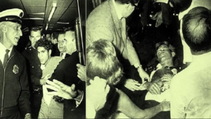 يمين: روبرت كندي أثناء محاولة إسعافه في أعقاب الاغتيال. يسار: سرحان سرحان عند اعتقاله.