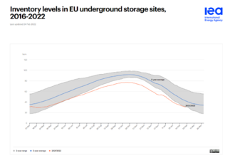 Russia has also been reducing its piped gas supplies to the EU market, while choosing not fill its storage sites in the EU to adequate levels, even in the middle of the heating season in the fourth quarter of 2021 and in early 2022.[29][26] As a consequence of low inventory levels at the beginning of the heating season, and the sharp decline of Russian piped flows to the EU, European gas storage levels fell to 30% below their working storage capacity (and standing 28% below their 5-year average levels for this period of the year). Storage sites owned or controlled by Gazprom, the Russian state-owned energy corporation, had particularly low storage levels at the start of the heating season, filled to just 25% of their working storage capacity. While Gazprom storages account for just 10% of the EU total working storage capacity, they accounted for half of the EU’s 5-year storage deficit. Without the strong increase in LNG imports since October 2021, European storage levels would have been less than 15% full by February 2022 (vs 31% in reality), leaving Europe in a much more vulnerable position vis-à-vis late cold spells or supply disruptions.[26] For context, expert analysis suggests that fill levels of at least 90% of working storage capacity by 1 October are necessary to provide an adequate buffer for the European gas market through the winter heating season.[8]