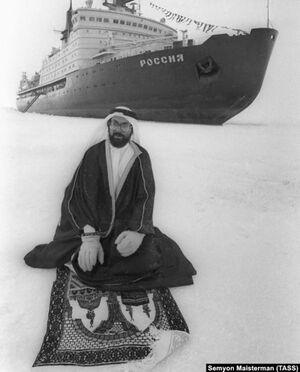 العالِم السعودي. إبراهيم العالم، يصلي في الدائرة القطبية الشمالية، مع البحرية السوفيتية في 1990 قبيل انهيار الاتحاد السوفيتي.