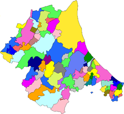 خريطة بلديات رومانيا في 2009 (RA = Province of Ravenna, FC = Province of Forlì-Cesena, RN = Province of Rimini, RSM = Republic of San Marino