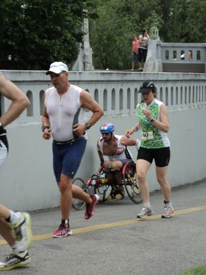 A wheelchair athlete competes in the running segment of the Ironman 70.3 triathlon أقيمت في بويزي، أيداهو في يونيو 2011.