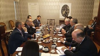 وزير خارجية قبرص، يوانس كاتسوليدس (أقصى اليسار) ووزير خارجية اليونان نيكوس كوتزياس (أدنى اليسار) يلتقيان وزير خارجية فلسطين، د. رياض المالكي (منتصف اليمين). على هامش انعقاد الجمعية العامة للأمم المتحدة في نيويورك، 21 سبتمبر 2016.