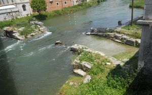 Curius Dentatus drained a large portion of the lake by diverting the Velino river into the Nera (thus giving birth to Marmore Falls). The wide area once occupied by the lake turned into a fertile plain (the Rieti Valley). Following Roman customs, the land was split into characteristic square allotments. The town itself underwent significant development, being re-organised according to typical Roman urban standards (e.g., two crossed roads make up the settlement's backbone), and was fortified with strong walls. A stone bridge was laid across the Velino river, and a large viaduct was built to bring goods from the Via Salaria directly to Rieti's southern gate.