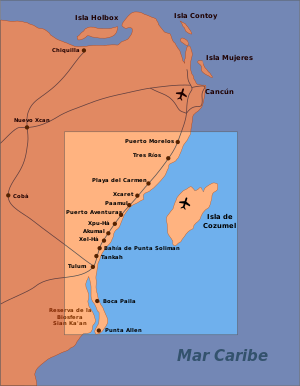 ريڤييرا مايا (Riviera Maya ؛ النطق الإسپاني: [ri'βjeɾa 'maʝa]) هي منطقة سياحة ومنتجعات في المكسيك. It straddles the coastal Highway 307 along the Caribbean coastline of the state of Quintana Roo, located on the eastern portion of the شبه جزيرة يوكاتان. This district historically started at the city of Playa del Carmen and ended at the village of Tulum, although the towns of Puerto Morelos situated to the north and between Playa del Carmen and Cancun as well as the town of Felipe Carrillo Puerto situated 40 كيلومتر (25 mi) to the south of Tulum are both currently being promoted كجزء من الرواق السياحي ريڤييرا مايا.