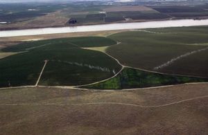 صورة من الفضاء لحقول الري المركزي في واحة الكفرة، ليبيا. الصورة التقطها مرصد الأرض على متن المحطة الفضائية الدولية 28 اكتوبر 2004. كل حقل دائري قطره كيلومتر واحد. الدوائر الغامقة تشير لمحاصيل شعير وبرسيم (ألفا ألفا) لم يتم حصادها بعد. الدوائر الفاتحة هي حقول تم حصادها أو غير مستعملة.