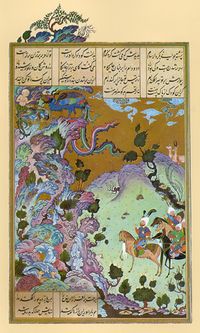 Monument of Ferdowsi on his memorial square in Tehran.At the feet of the poet the heroes of his epic Shahnameh future hero Zal and bird Simurgh.
