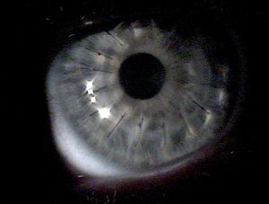 ![]() زرع القرنية بعد حوالي أسبوع من الجراحة. تعدد إنعكاسات الضوء يبيّن ثنايا في القرنية، ستنحل لاحقاً. | |