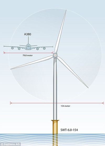 على مدى العقود القليلة الماضية، قيل لنا طاقة الرياح ستكون واسعة النطاق. الآن عملاق التصنيع سيمنز تتخذ هذا حرفيا، من خلال بناء أكبر توربينات في العالم - حيث كل شفرة ذات قياس مذهل 75 مترا في الطول. وهذا يعني أن كل واحدة منهم ليست سوى جزء أقصر قليلا من طائرة لنقل المسافرين أكبر من أي وقت مضى - لطائرة ايرباص A380 ، مع جناحيها قياس 79.8 مترا.