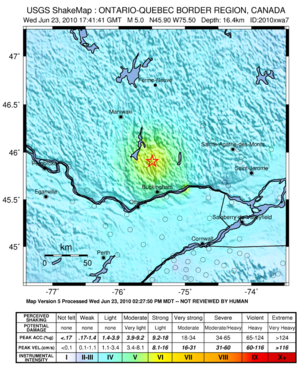 4. ^ "Magnitude 5.0 – ONTARIO-QUEBEC BORDER REGION, CANADA". USGS. Archived from the original on 26 June 2010. Retrieved 23 June 2010. {{cite web}}: Unknown parameter |deadurl= ignored (|url-status= suggested) (help)