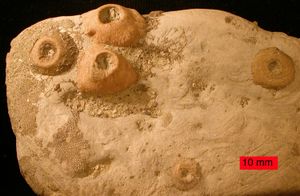 Crinoid columnals (Isocrinus nicoleti) from the Middle Jurassic Carmel Formation at Mount Carmel Junction, Utah. Scale in mm.