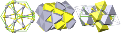 Crystal structure of cinnabar: yellow = sulfur, grey = mercury, green = cell