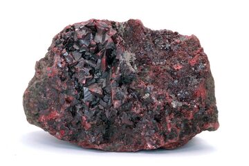 Specimen composed of pure cinnabar, with the surface covered in crystals. Being an old specimen, they are partially darkened due to exposure to light. Almadén Mine, (Ciudad Real), Spain. Largest dimension, 6 cm.
