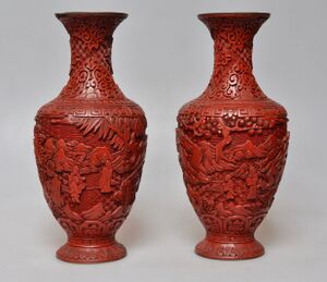 The most popularly known use of cinnabar is in Chinese carved lacquerware, a technique that apparently originated in the Song dynasty.[36] The danger of mercury poisoning may be reduced in ancient lacquerware by entraining the powdered pigment in lacquer,[37][صفحة مطلوبة] but could still pose an environmental hazard if the pieces were accidentally destroyed. In the modern jewellery industry, the toxic pigment is replaced by a resin-based polymer that approximates the appearance of pigmented lacquer.[بحاجة لمصدر]