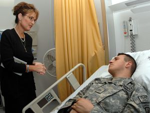 پالين تزور الجرحى في المستشفى العسكري الأمريكي في لاندشتول, ألمانيا, يوليو 2007