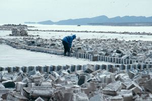 منتج الملح التقليدي في السالار. تستخدم كتل الملح هذه لبناء فنادق الملح.
