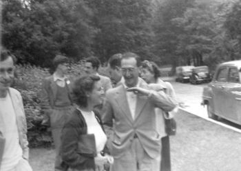 سلڤادور لوريا مع إستر لدربرگ في سيمپوزيوم كولد سپرنگ هاربر 1953. في الخلفية يظهر آرون نوڤيك، بروس ستوكر، هايگ پاپازيان، وجرالدين ليندگرن.