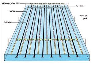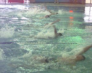 ويجب أن يكون عمق الماء في المسابح القانونية 1,2 مترًا على الأقل. وفي درجة حرارة حوالي 26°م. ويوجد بطول حوض السباحة عوامات تسمى خطوط الممر، وهي تحدد حدود الممر، وتساعد في حفظ سطح الماء ساكنًا.