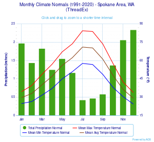 Spokane is located on the Spokane River in eastern Washington at an elevation of 1،843 أقدام (562 m) above sea level,[93] about 18 ميل (29 km) from Idaho, 92 ميل (148 km) south of the Canadian border, 229 ميل (369 km) due east of Seattle, and 279 ميل (449 km) southwest of Calgary.[94] The lowest elevation in the city of Spokane is the northernmost point of the Spokane River within city limits (in Riverside State Park) at 1،608 أقدام (490 m); the highest elevation is on the northeast side, near the community of Hillyard (though closer to Beacon Hill and the North Hill Reservoir) at 2،591 أقدام (790 m).[95] Spokane is part of the Inland Northwest region, consisting of eastern Washington, north Idaho, northwestern Montana, and northeastern Oregon.[96] The city has a total area of 60.02 ميل مربع (155.45 km2), of which 59.25 ميل مربع (153.46 km2) is land and 0.77 ميل مربع (1.99 km2) is water.[97]
