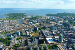 Aerial drone shot of the Downtown and South End neighborhoods of Stamford, Connecticut with Long Island in the distance.