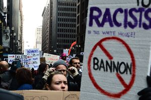 في 15 نوفمبر 2016، أرسل النائب الأمريكي ديڤد سيسيلين من رود آيلاند رسالة لترمپ وقع عليها 169 عضواً ديمقراطياً في مجلس النواب يحث الرئيس المنتخب على إلغاء تعيينه لبانون. وجاء في الرسالة أن تعيين بانون "يبعث برسالة مقلقة حول توجه الرئيس الذي يريد دونالد ترمپ أن يكون"،[54][55][56] لأن "علاقاته بالحركة القومية البيضاء موثقة جيداً"؛ واستمر في تقديم عدة أمثلة على رهاب الأجانب المزعوم لبرايتبارت نيوز.[57] نفى بانون كونه قومياً أبيض وادعى، بالأحرى، أنه كان "قومياً اقتصادياً".[58]