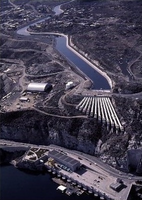 سد جراند كولي is a concrete gravity dam on the Columbia River in the U.S. state of Washington, built to produce hydroelectric power and provide irrigation water. Constructed between 1933 and 1942, Grand Coulee originally had two powerhouses. The third powerhouse ("Nat"), completed in 1974 to increase energy production, makes Grand Coulee the largest power station in the United States by nameplate capacity at 6,809 MW.[6]
