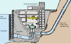 Water is pumped via the Pump-Generating Plant's 12-قدم (3.7 m) diameter pipes 280 ft (85 m) from Lake Roosevelt to a 1.6 mi (2.6 km) feeder canal. From the feeder canal, the water is transferred to Banks Lake which has an active storage of 715،000 acre⋅ft (882 million m3). The plant's twelve 65،000–70،000 حصان (48،000–52،000 kW) pumps can transfer up to 1،605 cu ft/s (45 m3/s) to the lake. Currently, the Columbia Basin Project irrigates 670،000 acre (2،700 km2) with a potential for 1.1 million.[72] Over 60 different crops are grown within the project and distributed throughout the United States.[61]