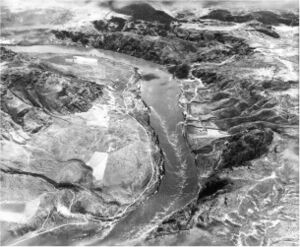 The Grand Coulee is an ancient river bed on the Columbia Plateau created during the Pliocene Epoch (Calabrian) by retreating glaciers and floods. Originally, geologists believed a glacier that diverted the Columbia River formed the Grand Coulee, but it was revealed in the mid-late 20th century that massive floods from Lake Missoula carved most of the gorge.[8] The earliest known proposal to irrigate the Grand Coulee with the Columbia River dates to 1892, when the Coulee City News and The Spokesman Review reported on a scheme by a man named Laughlin McLean to construct a 1،000 ft (305 m) dam across the Columbia River, high enough that water would back up into the Grand Coulee. A dam that size would have its reservoir encroach into Canada, which would violate treaties.[9] Soon after the Bureau of Reclamation was founded, it investigated a scheme for pumping water from the Columbia River to irrigate parts of central Washington. An attempt to raise funds for irrigation failed in 1914, as Washington voters rejected a bond measure.[10]