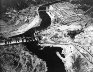 Further regulation of the Columbia's flows was necessary to make the new power plant feasible. It would require water storage and regulation projects in Canada and a treaty to resolve the many economic and political issues involved. The Bureau of Reclamation and Army Corps of Engineers explored alternatives that would not depend on a treaty with Canada, such as raising the level of Flathead Lake or Pend Oreille Lake, but both proposals faced strong local opposition.[62] The Columbia River Treaty, which had been discussed between the U.S. and Canada since 1944, was seen as the answer. Efforts to build the Third Powerplant were also influenced by competition with the Soviet Union, which had constructed power plants on the Volga River larger than Grand Coulee.[65]
