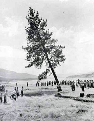 In late 1938, the Works Progress Administration began clearing what would be 54،000 acre (220 km2) of trees and other plants. The cut timber was floated downstream and sold to the highest bidder, Lincoln Lumber Company, which paid $2.25 per thousand board feet, equivalent to $37 in 2022.[50] The pace of clearing was accelerated in April 1941 when it was declared a national defense project, and the last tree was felled on July 19, 1941. The felling was done by Reclamation Supervising Engineer Frank A. Banks and State WPA Administrator Carl W. Smith during a ceremony.[51] 2,626 people living in five main camps along the Columbia worked on the project. When it was finished, $4.9 million had been spent in labor.[52]