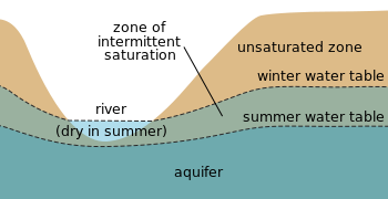 In some regions, for example, Great Britain or California, winter precipitation is often higher than summer precipitation and so the groundwater storage is not fully recharged in summer. Consequently, the water table is lower during the summer. This disparity between the level of the winter and summer water table is known as the "zone of intermittent saturation", wherein the water table will fluctuate in response to climatic conditions.
