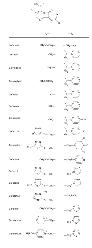 إلّا أنّ الفارق بينهما (البينيسيلّينات والسيفالوسبورينات) هو أنّ الثانية تضمّ حلقةً سداسيّة عوضًا عن الحلقة الخماسيّة -التي تضمّ عنصر الكبريت Sulphur- المجاورة لحلقة البيتالاكتام.