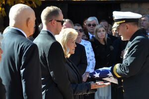 In September 2013, Carpenter suffered a stroke and was hospitalized in the Swedish Medical Center in Denver. He was then admitted to the Denver Hospice Inpatient Care Center. He died on October 10, 2013, at the age of 88. He was survived by his wife, four sons and two daughters, a granddaughter, and five step-grandchildren.[77][74] The Governor of Colorado, John Hickenlooper, ordered flags to be flown at half mast. A public memorial service was held at St. John's Episcopal Church in Boulder, which was attended by fellow astronauts John Glenn, Gene Cernan, Charles Duke, Rusty Schweickart, Jack Schmitt, David Scott, Charles Bolden, Dan Brandenstein, Bob Crippen, Bruce McCandless II, Dick Truly and Charles D. Walker.[78] His remains were cremated and the ashes buried on the family's ranch near Steamboat Springs, Colorado.[79] When asked in 2012 what his legacy would be, he replied: "I was an astronaut and an aquanaut."[80]