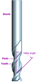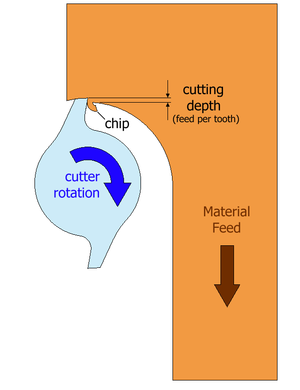 | Looking at the formula for the spindle speed, S, it can be seen that larger tools require lower spindle speeds, while small tools may be able to go at high speeds. | The formula for the feed rate, F shows that increasing S or z gives a higher feed rate. Therefore, machinists may choose a tool with the highest number of teeth that can still cope with the swarf load. |