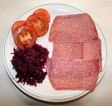 The word 'salami' in English comes from the plural form of the Italian salame[1] (النطق بالإيطالية: [saˈlaːme]). It is a singular or plural word in English for cured meats of a European (particularly Italian) style. In Romanian, Bulgarian, and Turkish, the word is salam; in Macedonian and Serbo-Croatian it is salama; in Hungarian, it is szalámi; in Czech it is salám; in Slovak, it is saláma; in Russian, Ukrainian, and Belarusian it is salyami while Polish, French, German, Greek and Dutch have the same word as English. The name may be derived from the Latin word salumen.[2][محل شك]