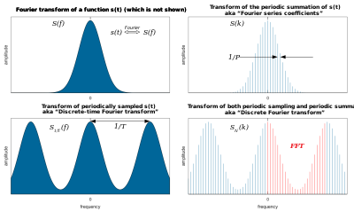 إذا كانت هي دالة موجودة في فاصل زمني بطول (وصفر في مكان آخر) ، فإن الربع العلوي الأيمن هو مثال على معاملات متسلسلة فورييه ()قد تبدو عند رسمها مقابل الترددات التوافقية المقابلة لها. الربع العلوي الأيسر هو تحويل فورييه المقابل لـ إن مجموع متسلسلة فورييه (غير معروضة)تركب تجميعًا دوريًا لـ   في حين أن تحويل فورييه المعكوس (غير موضح) يتولف فقط