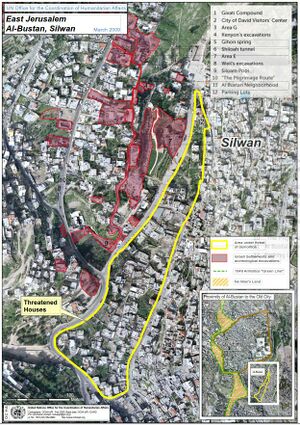 The group Ir Amim argues that the illegal construction is due to insufficient granting of permits by the Jerusalem municipality. They say that under Israeli administration, fewer than 20 permits, mainly minor, were issued for this part of Silwan, and that as a result, most building in this part of Silwan and the whole neighborhood generally lack permits.[46] They also say that as of 2009, the vast majority of buildings in the neighborhood were built without permits, in particular in al-Bustan.[47] In 2010, Ir Amim's petition to halt a municipal zoning plan for the City of David area was rejected. The plan does not call for demolition of illegal construction, but rather regulates where construction may continue. The group said that the plan favored the interests of Elad and the neighborhood's Jewish residents, while Elad said that the plan allotted only 15 percent of construction to Jews versus 85 percent to Arab residents. The mukhtar of Silwan objected to Ir Amim's petition against the plan. "We have said that there are good aspects of the plan and there are bad aspects of the plan, we’re still working it all out. But to come and say that the whole plan is bad, and to ask that it be done away with, then what have you accomplished? Nothing."[48]