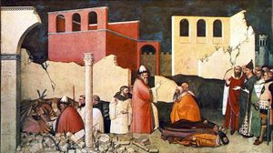 الپاپا سلڤستر الأول يظهر وهو يقتل تنين ويحيي ضحايا ذلك التنين، بريشة ماسو دي بانكو.