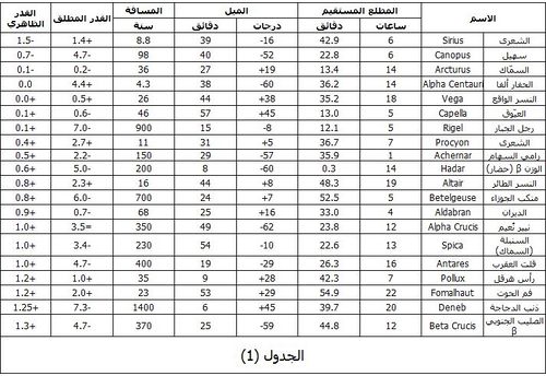يبين الجدول (1) بعض المعلومات الرئيسية عن أسطع عشرين نجماً. وقد رتبت وفق سطوعها المتناقص.
