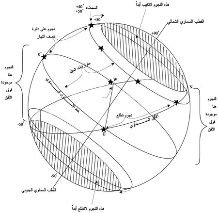 ويوضح الشكل (1) الدوائر اليومية للنجوم في خط العرض 40 ْ شمالاً. فالقطب السماوي الشمالي يرتفع 40 ْ فوق الأفق الشمالي، وتدور الكرة السماوية حوله. وإنْ وجّه المرء نظره إلى خط العرض 40 ْ شمالاً فإنه سيرى: