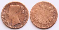 | الظهر: القيمة الاسمية، السنة و "شركة الهند الشرقية" منقوشة داخل إكليل. | الوجه: رأس متوّج يسار مع حروف الملكة ڤيكتوريا |