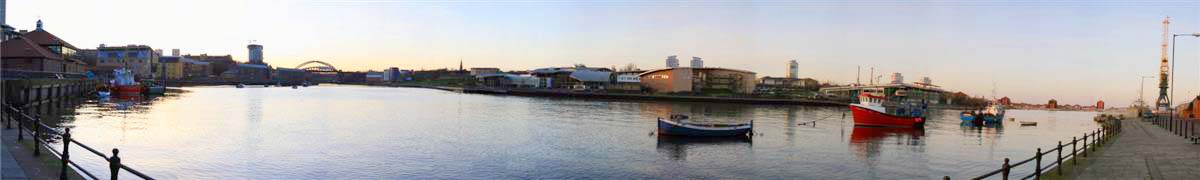 By row the minster and Wearmouth Bridge; the city hall, the Winter Gardens Museum and Penshaw Monument as well as a view of the marina