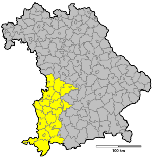 The county of Swabia is located in southwest Bavaria. It was annexed by Bavaria in 1803, is part of the historic region of Swabia and was formerly ruled by dukes of the Hohenstaufen dynasty. أثناء الفترة النازية، the area was separated from the rest of Bavaria to become the Gau Swabia. It was re-incorporated into Bavaria after the war.