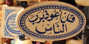 الأية الأولى من سورة الناس محفورة على الخشب، ومعروضة بأحد أسواق شوارع القاهرة القديمة.