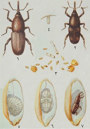 ومن أكثرها انتشاراً وشهرة في العالم أنواع السوس من الجنس Sitophilus Calandra) والمتخصص في مهاجمة الحبوب النجيلية كالقمح (سوسة القمح S.granaria L.) والشعير والأرز (سوسة الأرز S.oryzea L.) والذرة (سوسة الذرة S.zeamais L.). تضع إناث الأنواع المذكورة بيوضها في نقر تحدثها في سطح الحبوب. تتوجه اليرقات بعد فقس البيض إلى داخل الحبة حيث تتغذى بمحتوياتها متابعة تطورها. تترك الحشرات الكاملة الحبوب من خلال ثقوب غير منتظمة تحدثها ولتعيد دورة حياتها.