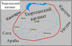 During the reign of Tong Yabgu Qaghan, Suyab was the principal capital of the Western Turkic Khaganate.[5] The khagan also had a summer capital in Navekat near the springs north of Tashkent in the Talas Valley, the capitals are being noted as the westernmost capital of Western Turkic Khaganate.[6] There was a sort of symbiosis, with the Sogdians responsible for economical prosperity and the گوقتورك in charge of the city's military security.