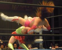 Pepper Parks (bottom) performing a belly-to-back suplex on RJ City.
