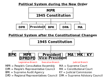 يوفر دستور 1945 انفصال محدود للسلطة التنفيذية، التشريعية، والقضائية. يوصف النظام الحكومة على أنه "رئاسي ذو خصائص برلمانية".[1] في أعقاب أحداث الشغب واقالة الرئيس سوهارتو، بدأ العمل في الكثير من الاصلاحات السياسية حسب التعديلات الدستورية، والتي أدت إلى تغيير جميع فروع الحكومة.