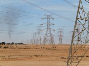 خطوط الطاقة العلوية في قطر. من على بعد يظهر الدخان المنبعث من إحدى مصافي النفط.