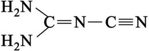 Cyanamide dimerizes to give 2-cyanoguanidine (dicyandiamide). This dimerization is disfavored by acids and is inhibited by low temperatures. The cyclic trimer is called melamine.[3]